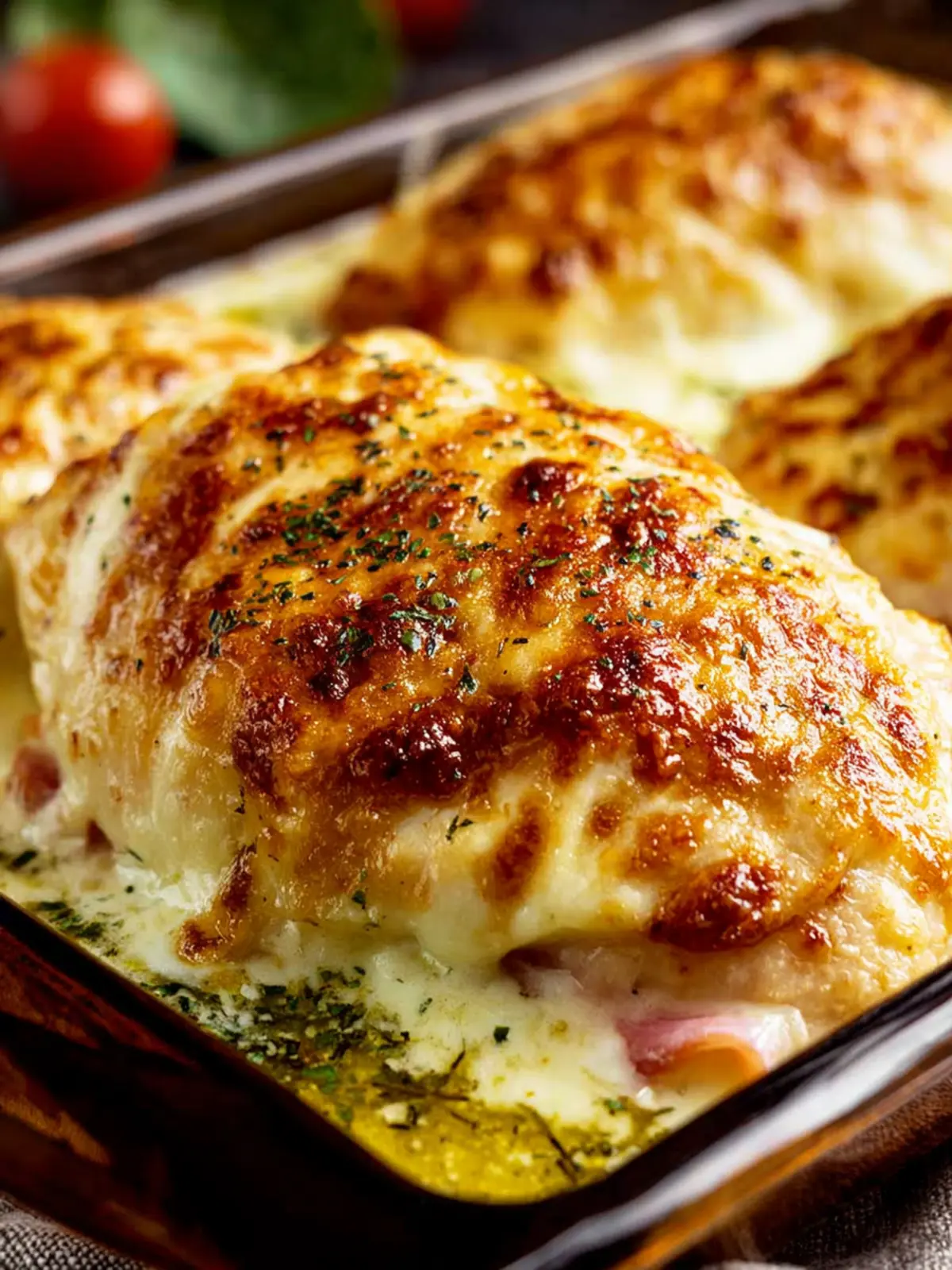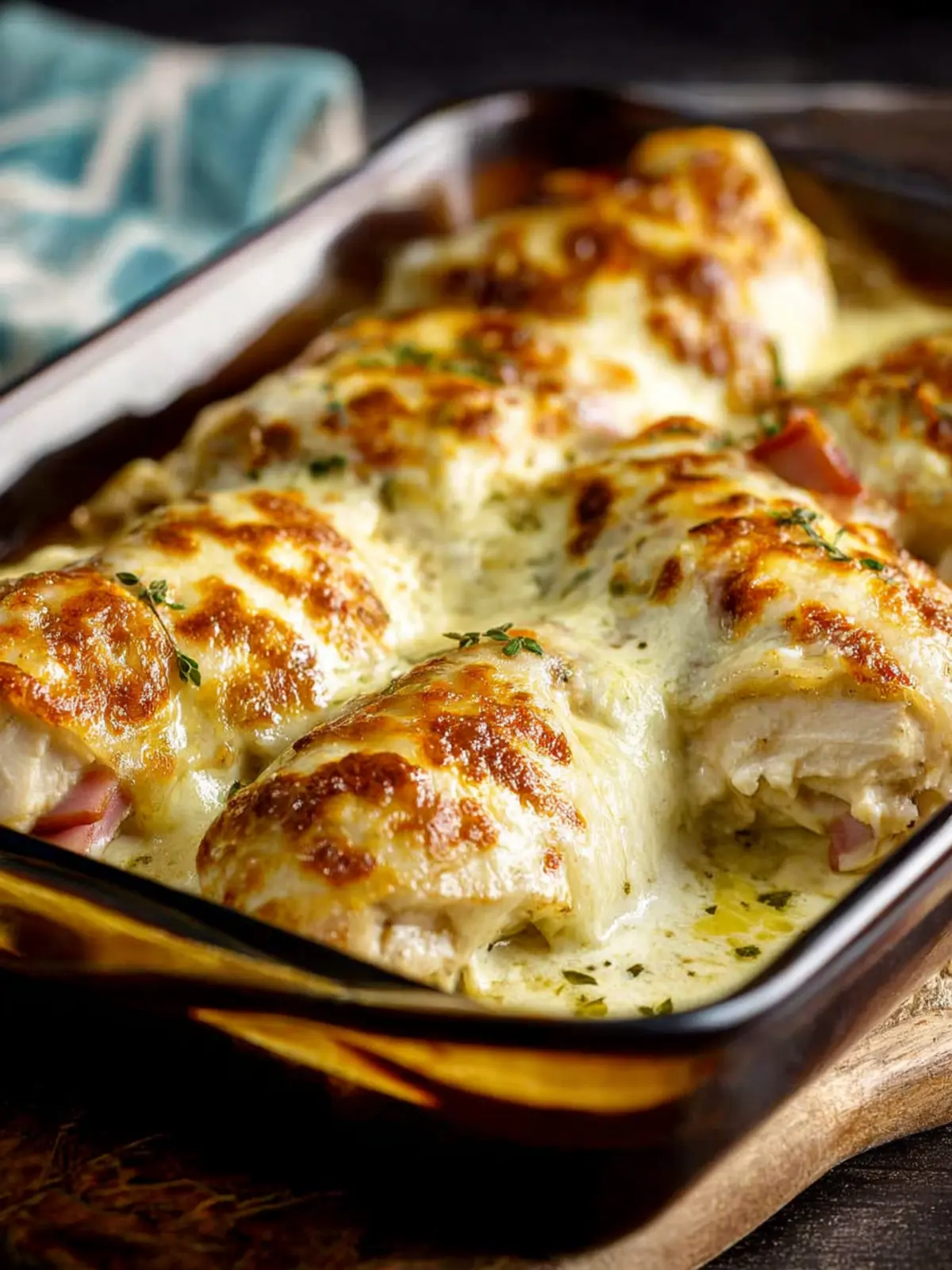 A delicious and easy recipe for Chicken Cordon Bleu Bake that combines chicken breasts with ham, Swiss cheese, and a creamy sauce.