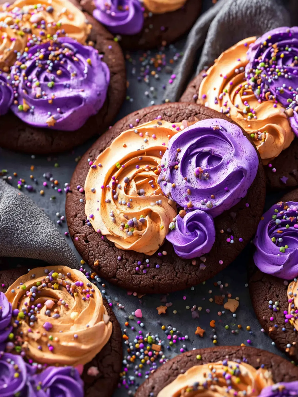 Delicious chocolate cookies topped with creamy frosting and colorful sprinkles.