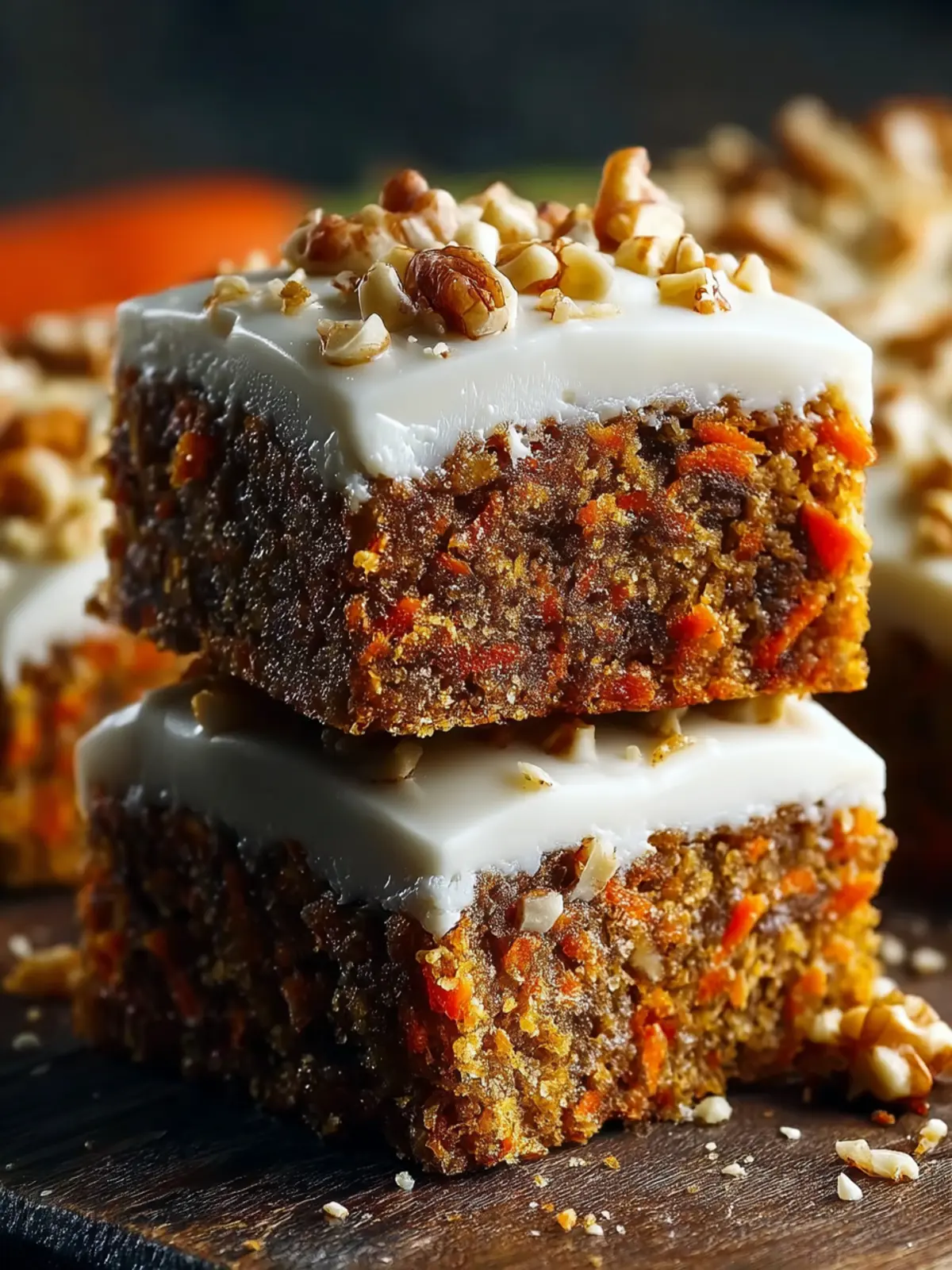 - Spread the cream cheese frosting generously over the cooled carrot cake bars.