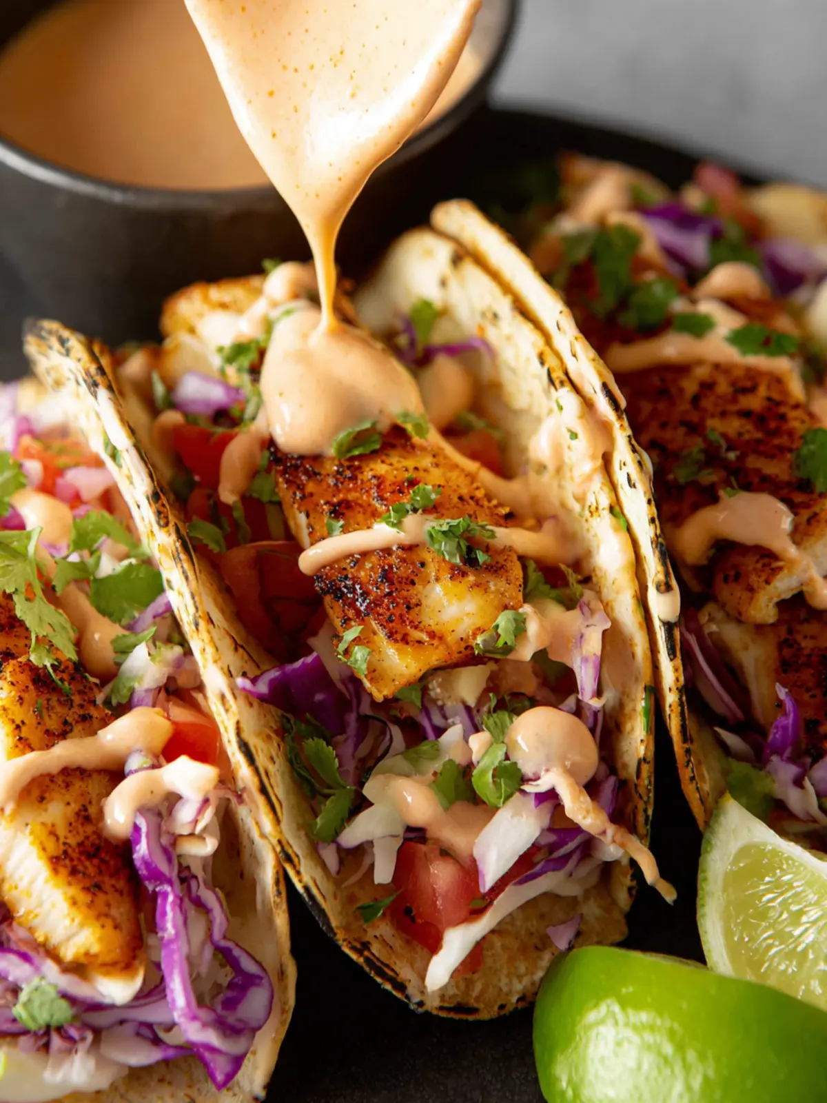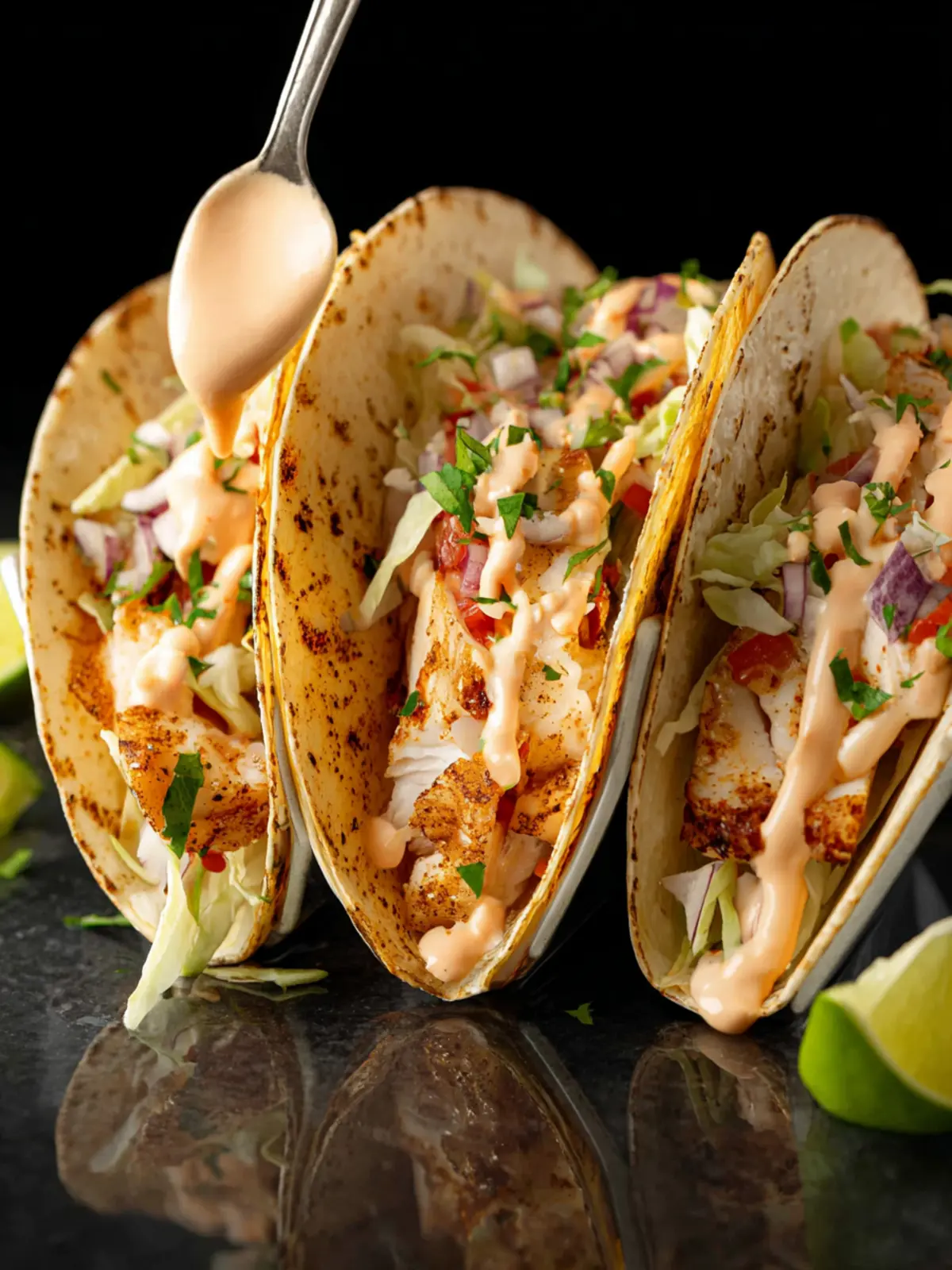 Delicious crispy fish tacos with a creamy sauce and fresh toppings.