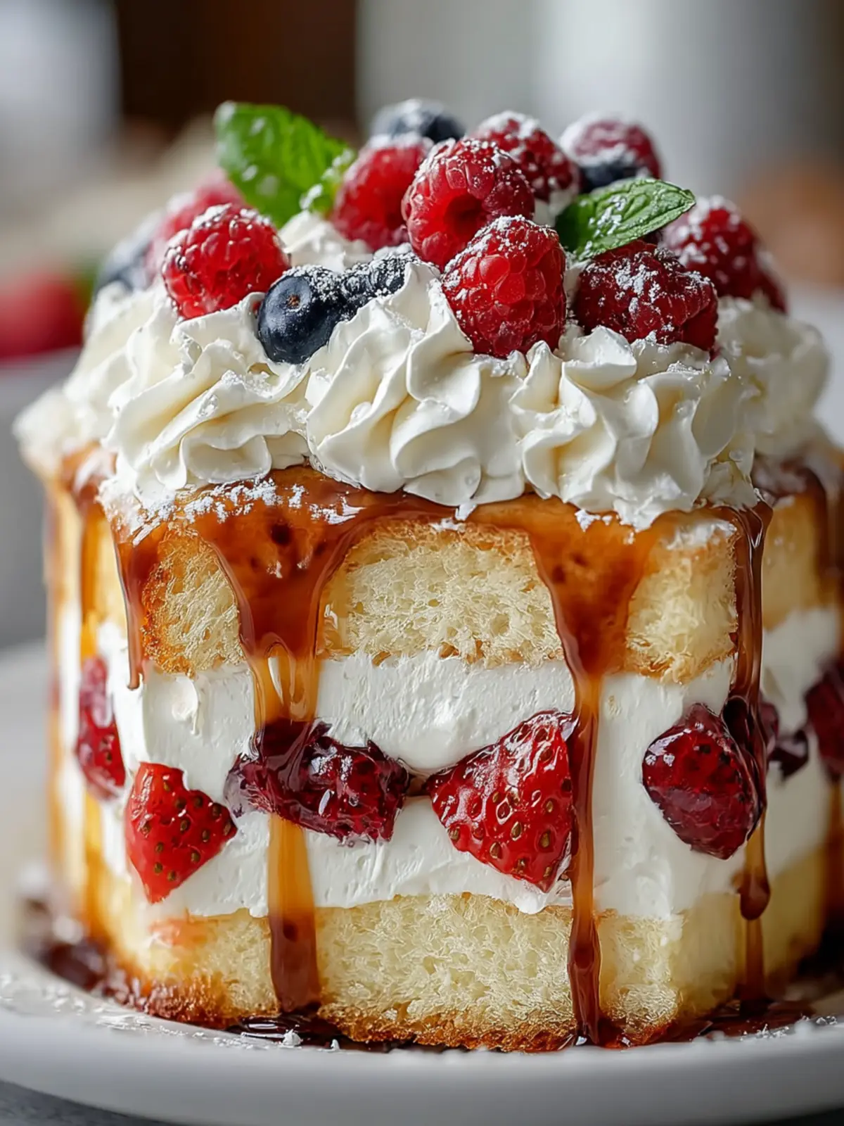 A delicious mixed berry trifle with layers of angel food cake, berries, and creamy pudding.