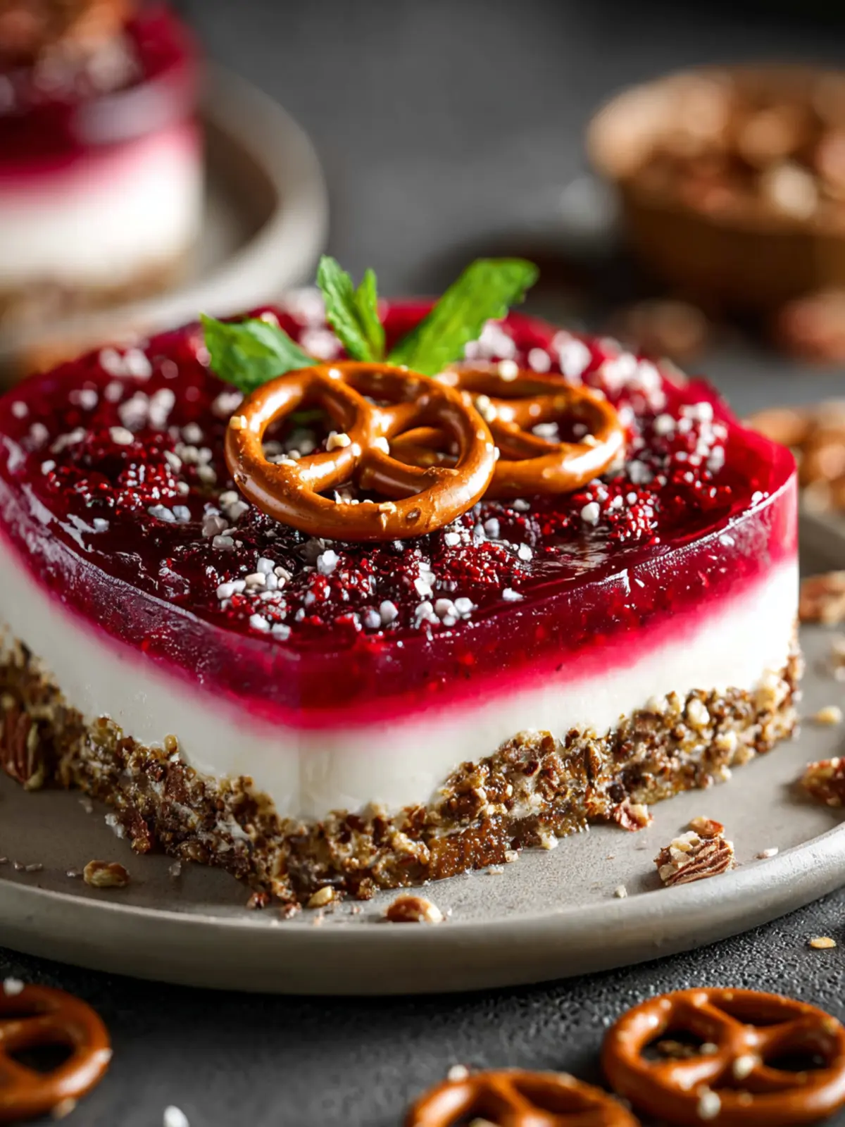 Pair with Fresh Fruits: The crunchiness of the pretzel base contrasts beautifully with fresh strawberries or blueberries. Their sweetness enhances the creaminess of the salad, creating a well-balanced bite.