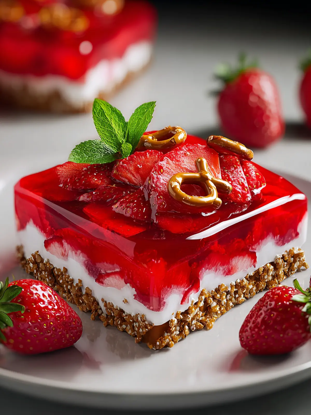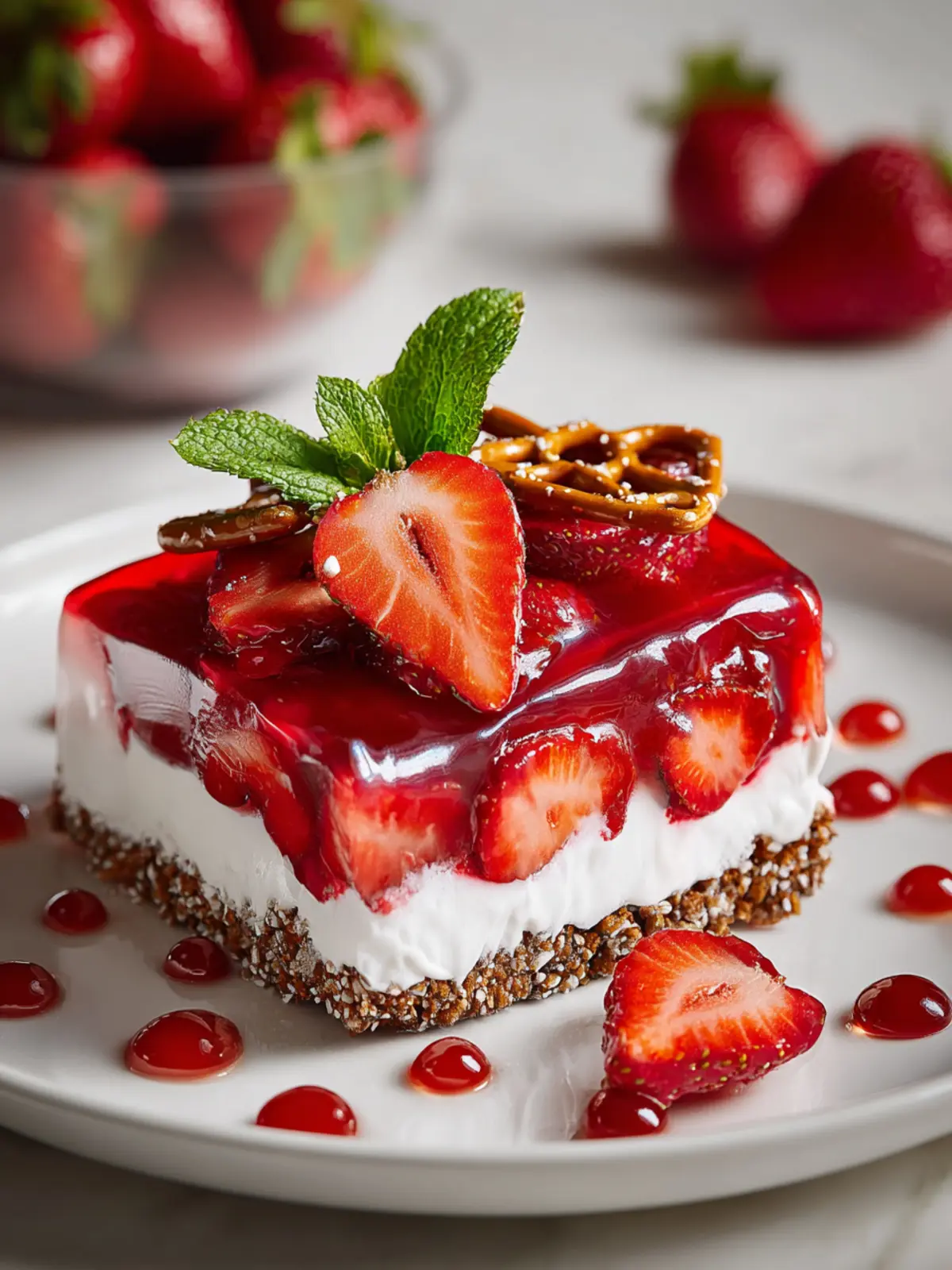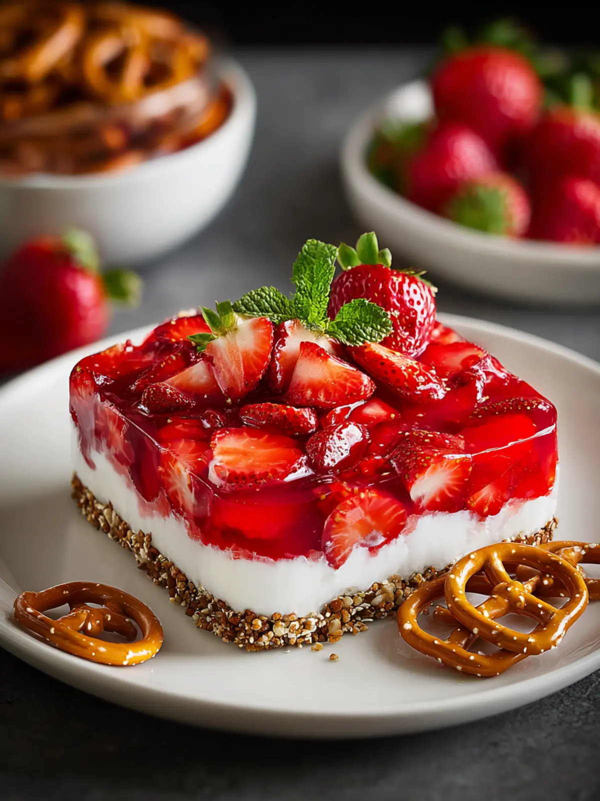 A delightful dessert combining a crunchy pretzel crust, creamy filling, and fresh strawberries.